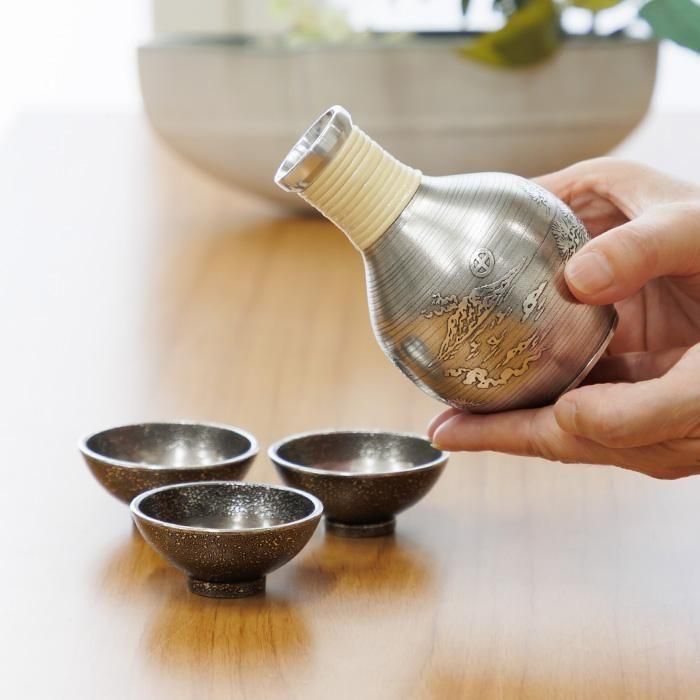 鹿児島に根付く"焼酎文化"を楽しむときは酒器にもこだわって、鹿児島県の伝統工芸品に認定されている「薩摩錫器」と一緒にいかがでしょうか。 徳利(とっくり)のような形状のちろりと盃を組み合わせた酒器セットです。全体に黒漆加工を施し、桜島の柄をいれました。 一合分以上のお酒が入るサイズです。日本酒や、あらかじめ水割りした焼酎を入れてお楽しみください。