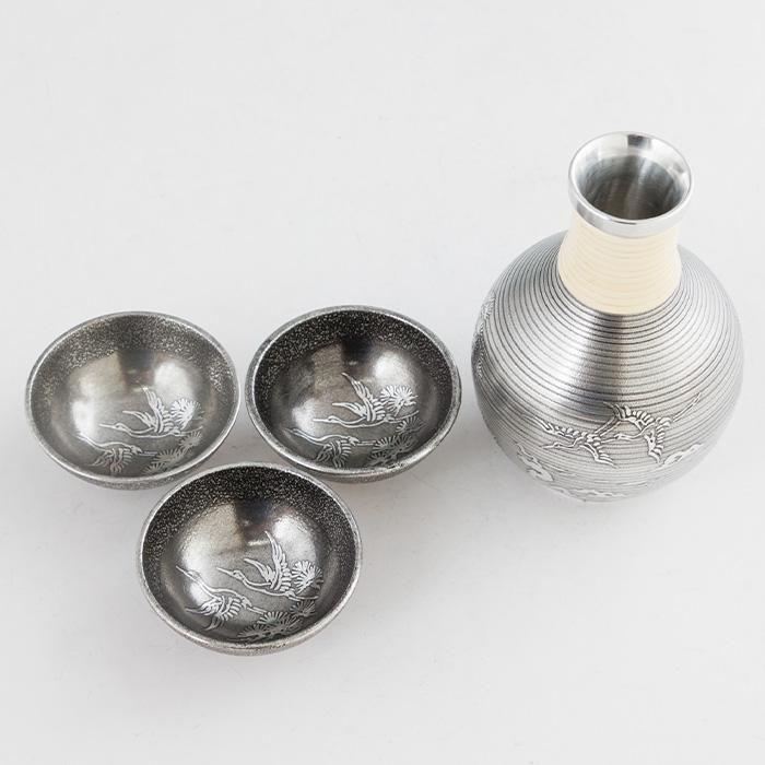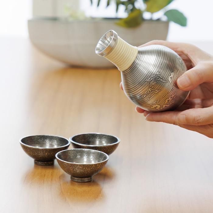 錫 酒器セット 鶴 盃3ヶ 黒漆加工 200ml [No.63-2]