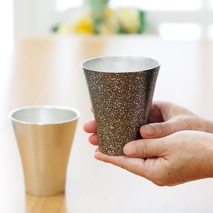 錫は、抗菌性・熱伝導性・耐久性に優れた素材で、古来より神事の酒器にも使われてきました。飲み物の雑味を取り除きまろやかにすると言われており、日本酒や焼酎、ビールなど、お酒の味わいを一層引き立ててくれます。